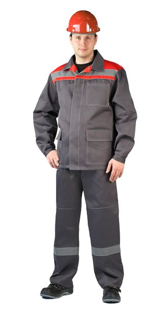 Костюм мужской летний, состоит из куртки и брюк. Куртка прямого силуэта – центральная супатная застежка на пуговицы, отложной воротник, кокетка полочек и спинки выделены светоотражающим кантом и широкой лентой СОП, нагрудный накладной карман на левой полочке, нижние накладные карманы с клапанами, рукав на притачной манжете с застежкой на пуговицу, усилительные накладки в области локтя. Брюки прямые, с притачным поясом со шлевками для дополнительного применения ремня, центральная застежка гульфик на петли и пуговицы верхние накладные карманы с косым входом, в нижней части брюк широкая лента СОП.