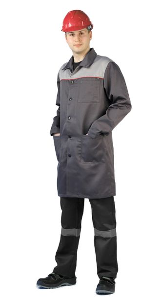 Халат с центральной застежкой на пуговицы, длинными рукавами с манжетами, на спинке шлица. Под кокеткой кант КРАСНЫЙ