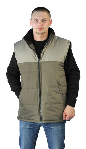 Жилет мужской, прямого силуэта, утепленный, кокетки полочек и спинки выделены отделочной тканью, нижние части - простеганы декоративными строчками с утеплителем - центральная застежка на молнию - нижние боковые прорезные карманы на молнии - внутренний нагрудный карман на молнии - воротник – стойка с подкладкой из мягкого флиса - утягивающая кулиса по низу