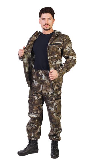 Камуфлированный унверсальный летний костюм для охоты, рыбалки и активного отдыха . Состоит из куртки с капюшоном и брюк. Куртка укороченная: - регулируемый капюшон, - центральная застежка молния, - накладные боковые и нагрудный карманы на молнии, - пояс и манжеты на резинке. Брюки: - пояс и низ брюк на резинке, - на передних половинках брюк карманы в швах, - по бокам накладные карманы на молнии. В зависимости от партии товара внешний вид и цвет может незначительно отличаться от представленных на странице изображений. При заказе этого товара уточните у менеджеров наличие таких расхождений.