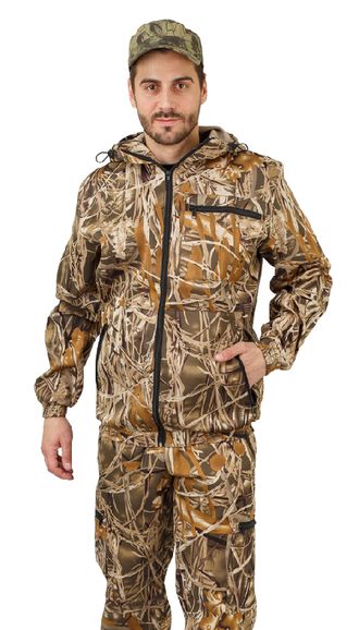 Камуфлированный унверсальный летний костюм для охоты, рыбалки и активного отдыха . Состоит из куртки с капюшоном и брюк. Куртка укороченная: - регулируемый капюшон, - центральная застежка молния, - накладные боковые и нагрудный карманы на молнии, - пояс и манжеты на резинке. Брюки: - пояс и низ брюк на резинке, - на передних половинках брюк карманы в швах, - по бокам накладные карманы на молнии. В зависимости от партии товара внешний вид и цвет может незначительно отличаться от представленных на странице изображений. При заказе этого товара уточните у менеджеров наличие таких расхождений.