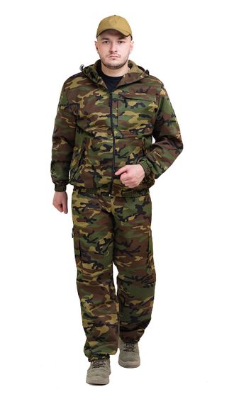 Камуфлированный универсальный летний костюм для охоты, рыбалки и активного отдыха . Состоит из куртки с капюшоном и брюк. Куртка: - Регулируемый капюшон. - Центральная застежка молния. - Боковые и нагрудный накладные карманы на молнии. - Низ куртки и манжеты на резинке. Брюки: - Два врезных кармана и два накладных кармана на молнии. - Пояс и низ брюк на резинке.