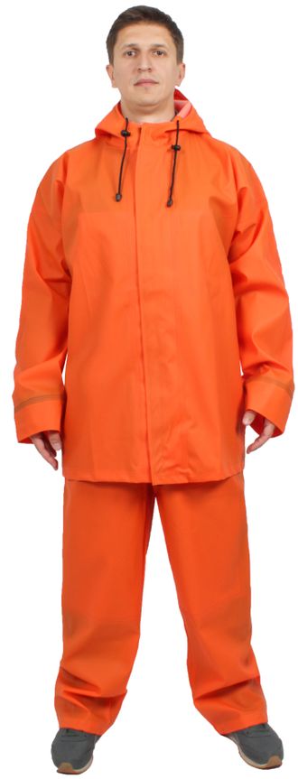 Изготовлен из ПВХ ткани морозо,МБС, КЩС. Ярко-оранжевого цвета. Толщина 0.5мм. Состоит из куртки-застегивается на молнию и липы, внутренние манжеты на рукавах надежно защищают от попадания воды, с капюшоном и полукомбинезона регулируемого по ширине с помощью кнопок.. Швы "свариваются"током ВЧ, что делает костюм более прочным и герметичным. Современная, практичная с увеличенной износостойкостью, мягкая. удобная в носке модель. Возможно изготовление с СОП, при этом цена увеличится на 200 рублей.