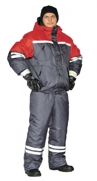 Универсальный костюм для работы и активного отдыха при низких температурах. Состоит из укороченной куртки на поясе с капюшоном и полукомбинезона. Куртка: • Центральная застежка-молния, закрытая двумя ветрозащитными планками на кнопках + внутренняя планка, огибающая верх молнии. • Кокетки полочек, спинка, верхняя часть рукавов и боковые стороны капюшона из отделочной ткани. • Светоотражающие полосы шириной 25мм - на кокетках полочек и рукавах, 50мм - на кокетке спинки • Нагрудный прорезной карман на молнии на левой полочке. • Фигурные накладные карманы с клапаном в нижней части полочек и на груди справа • Рукава на притачной манжете с резинкой, объем регулируется с помощью паты на кнопке. • Низ куртки на поясе, боковые стороны стянуты резинкой. • Капюшон втачной, с цельнокроенным козырьком, объем капюшона по лицевой части регулируется кулиской со шнуром и фиксаторами, на затылочной части - с помощью хлястиков и пряжки. • Подкладка куртки с утеплителем, внутренний карман левой полочки на липучке. Полукомбинезон: • С центральной застежкой на молнию и ветрозащитной планкой, застегивающейся на кнопку • Высокая грудка и спинка. • По линии талии спинка стянута резинкой • Карманы с отрезным бочком, вход в карман усилен закрепками • В нижней части светоотражающие полосы шириной 25мм • Мягкие регулируемые бретели с эластичной лентой. • Подкладка с утеплителем, простегана вертикальными стегальными строчками.