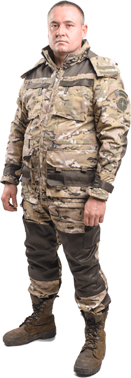 Функциональный крой не сковывает движений. Куртка на молнии с отстёгивающимся капюшоном. Брюки с пыльниками для защиты от грязи и клеща, а так же системой подтяжек.