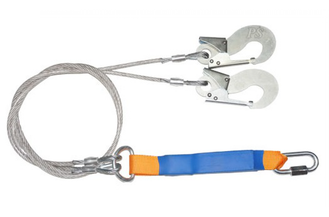 Страховочный строп двойной (двуплечий) из металлического троса в ПВХ оболочке с амортизатором двумя монтажными и одним соединительным карабином Строп аБд+Кс