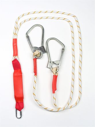 Страховочный строп, двойной (двуплечий) из полиамидной веревки с амортизатором, двумя монтажными (К50 это карабин с раскрытием зева 50мм) и одним соединительным карабином.